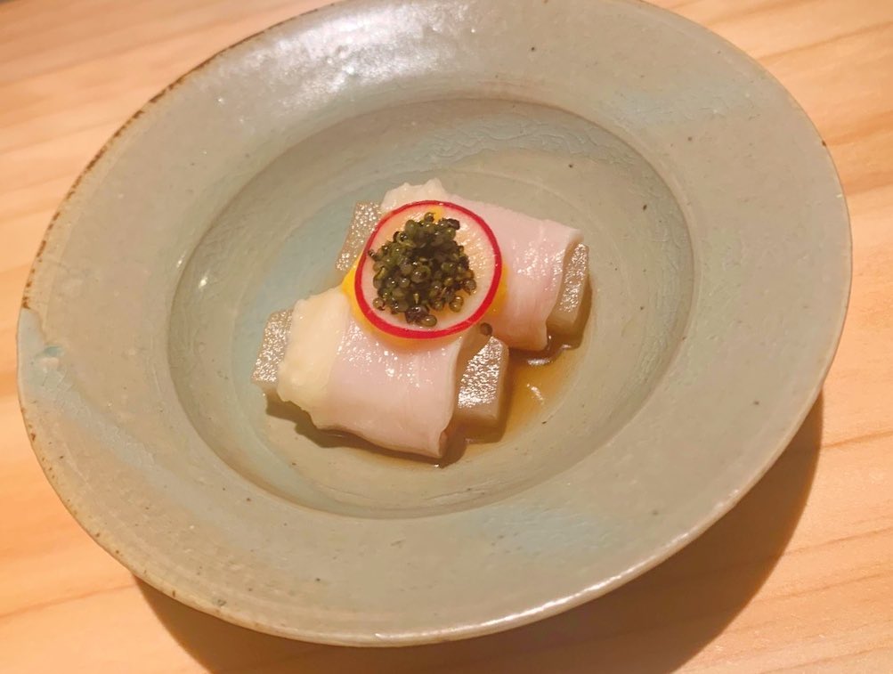 さて、2枚目の写真ですが前菜の土佐酢大根の胸肉巻きです。