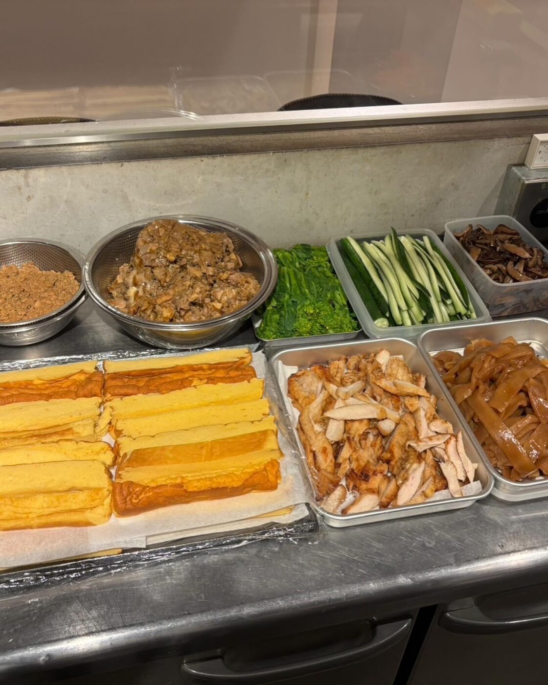 すり身入り卵焼き、鶏そぼろ、きゅうり、人参うま煮、菜の花昆布締め、椎茸艶煮、干瓢、胸肉唐揚げ、鶏もも甘辛煮、糸鰹とボリュームある具材。