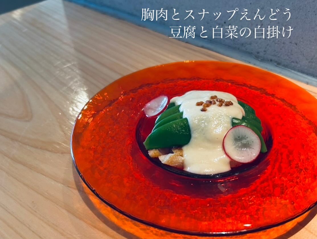 歯応えの良いスナップエンドウと甘味のある白かけが♀️胸肉はしゃぶしゃぶしており、白かけと絡めてお召し上がり下さい